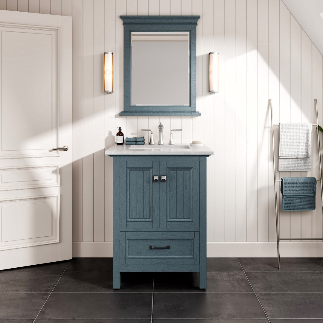 The Eviva Britney 24" bathroom vanity brings a blend of rustic and contemporary styles to your bathroom giving it a unique and warm feel. Its wooden textured muted ash blue finish makes it look and feel elegant and unique and makes it suitable for a wide range of bathroom layouts.